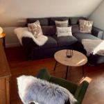 Großer Gesellschaftsraum mit Tisch und Stühlen für 20 Personen, Kinderhochstühlen, Sofaecke, Holzofen, 55-Zoll-Smart-TV mit HDMI, USB und W-LAN.