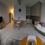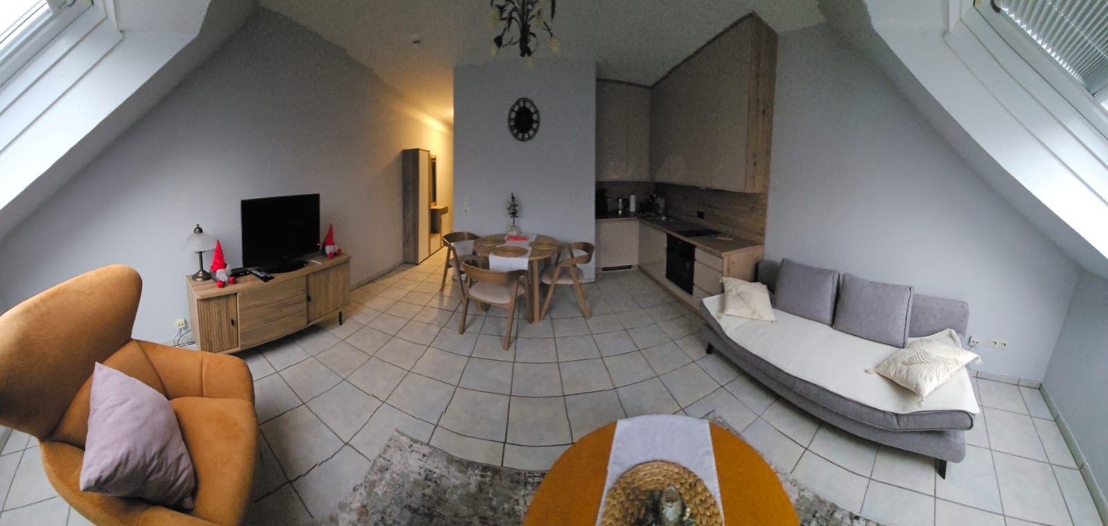 Die voll ausgestattete Küchenzeile lässt keine Wünsche offen: Ein Geschirrspüler, eine Mikrowelle, ein Wasserkocher und eine Kaffeemaschine stehen bereit, damit Sie sich jederzeit kulinarisch verwöhnen können. Ein gemütlicher Essbereich lädt zum gemeinsamen Frühstück ein. Für entspannte Abende sorgt der TV, während das kostenfreie WLAN Ihnen jederzeit Verbindung zur Welt bietet.